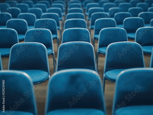 Rows of Empty Blue Chairs Awaiting an Event or Presentation, Showing a sense of order