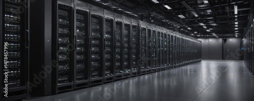 Rows of humming servers in a modern data center, cloud computing, cybersecurity
