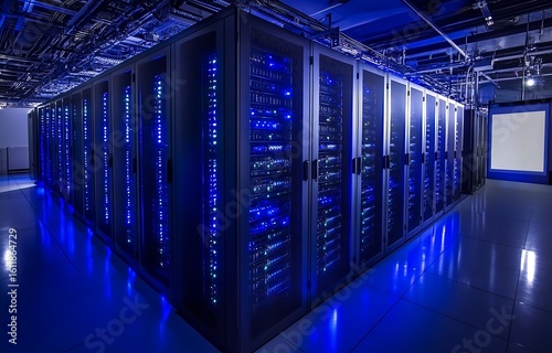 Rows of illuminated server racks with vibrant blue lights creating a futuristic and high tech atmosphere in a modern data center