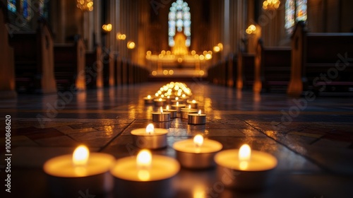 Rows of lit candles flickering with a beautiful church altar in the distance, highlighting a moment of reflection.