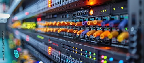 Rows of modular server racks and communication equipment in a futuristic data center or server room