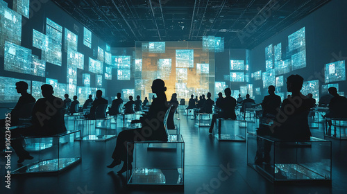 Rows of People Sitting at Floating Glass Desks, Surrounded by Projected Visuals in a High-Tech Auditorium