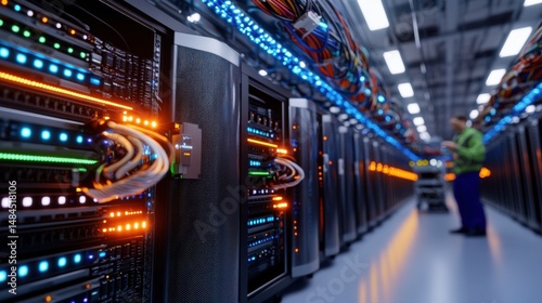 Rows of servers are stacked in a data center, with colorful LED lights illuminating the cables. A technician is working diligently in the background during a busy operational period