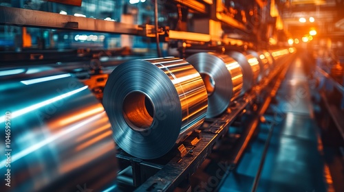 Rows of shiny steel coils are neatly arranged in a large industrial manufacturing facility, symbolizing production, industry, and modern engineering efficiency.