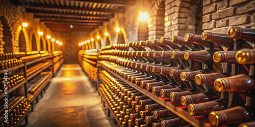 Rows of wine bottles in a warmly lit cellar , wine, bottles, cellar, vintage, winery, storage, display, shelf, collection