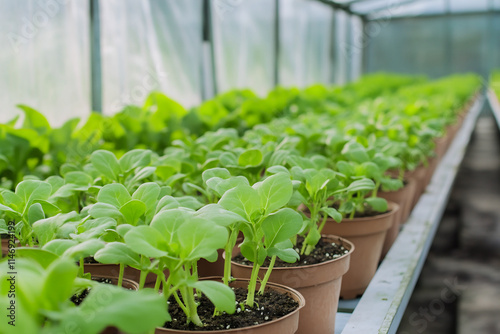 Rows of young plants in small pots, neatly arranged in a greenhouse