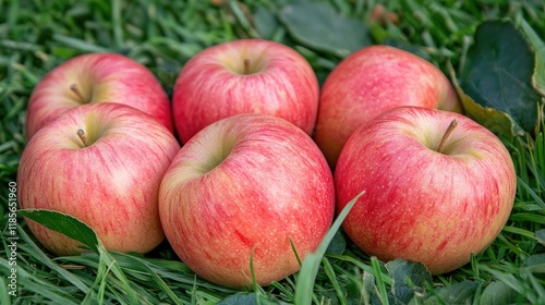 Royal Gala Apples arranged naturally on green grass surrounded by leaves showcasing vibrant colors and freshness in a natural setting