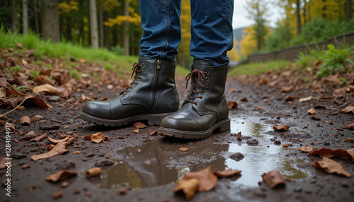 Rubber boots standing in muddy path surrounded by autumn leaves, nature
