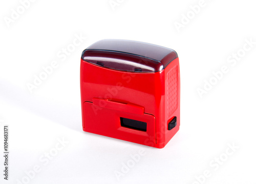 Rubber stamp. Mechanism of a seal on a white background. Red, office, automatic, rubber stamp