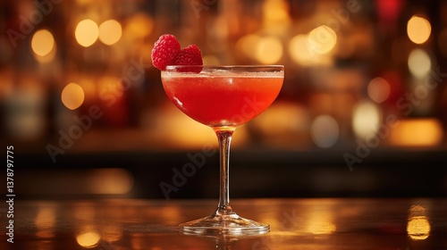 Ruby red cocktail, raspberries, and a reflective surface create a vibrant, close-up indulgence