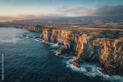 Rugged cliffs rise dramatically from a remote coastline, with crashing waves and golden sunlight illuminating the scene during sunrise