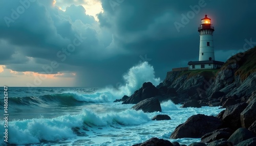 Rugged coastal lighthouse battered by a fierce storm, waves crashing against rocks , landscape, fog, weathering