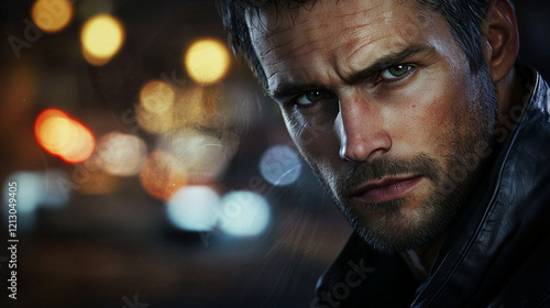 Rugged Detective in Urban Setting with Intense Gaze