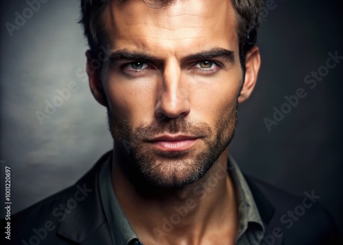 Ruggedly handsome male face with strong jawline and defined facial features, adorned with a thick, dark five o'clock