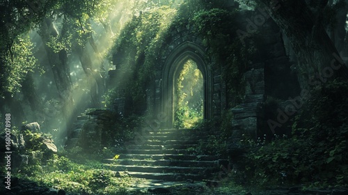Ruined stone archway covered in moss and vines leads to a bright light through steps