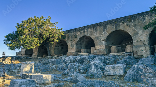 Ruins of a temple on top of a cliff. Greece, Lindos Acropolis - June 17, 2021. The ruins of the temple on the top of the cliff, bottom close-up view.
