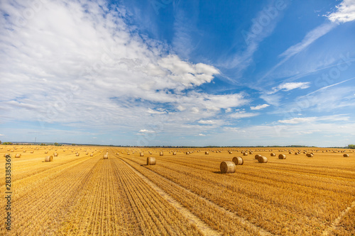 Rundballen Stroh liegen auf dem Acker zur Abholung
