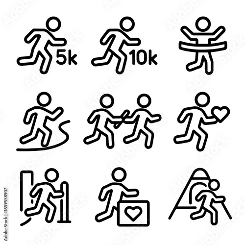 Running Event Icons. Outline icon set of running events: 5k race, 10k race, half marathon, full marathon, ultramarathon, relay