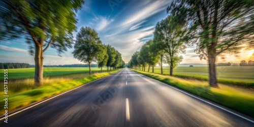 Rural Countryside Road Blur: A peaceful countryside road with fields and trees on either side, blurred to create a sense of motion.