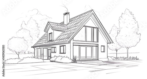 Rural family house vector illustration with simple line drawing, outline of the architecture in black color on a white background.