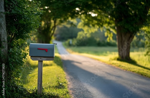Rural mailbox on a wooden post beside a quiet country road, surrounded by trees and soft morning sunlight. Peaceful countryside scene with long shadows and natural green landscape