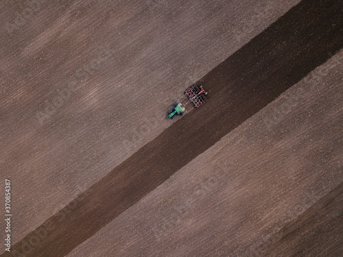 Russia, Moscow Oblast, Aerial view of tractor plowing brown field