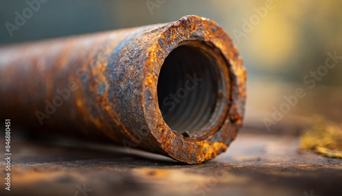 rusted lead pipe, highlighting detailed corrosion textures and patina. The pipe symbolizes decay, neglect, and the passage of time, with space for text on the side