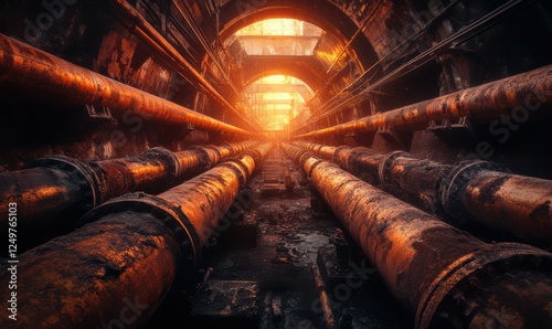 Rusted pipelines stretching into a fiery industrial horizon, capturing the dramatic essence of infrastructure decay, rich warm tones