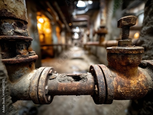 Rusted pipes twist through an abandoned industrial site with broken gauges and valves among crumbling walls