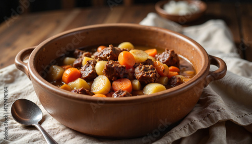 Rustic beef stew with vegetables in ceramic pot