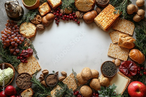 Rustic bread and herb border with crackers and grapes on white background