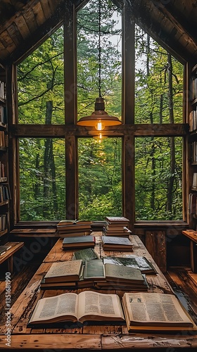 Rustic Cabin Forest View Open Books Reading Relaxation