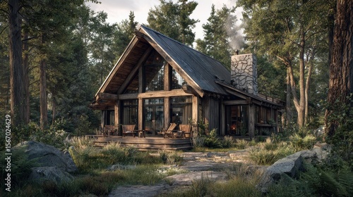 Rustic cabin with a contemporary twist. Woodsy retreat. A cozy hideaway blending traditional timber with sleek design elements