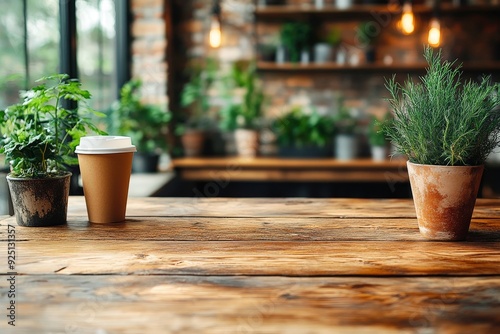 Rustic Cafe Tabletop: A rustic wooden table with a paper coffee cup and potted plants, with a blurred background of a cafe interior, perfect for showcasing your products or promoting a cozy atmosphere