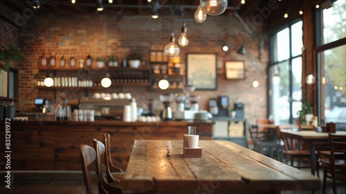 Rustic cafe with brick walls, wooden furniture, and warm pendant lights. View of counter and window seating in the morning light.
