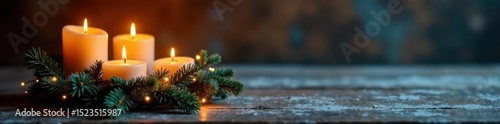 Rustic candles, Christmas wreath, cozy winter scene, december, glow