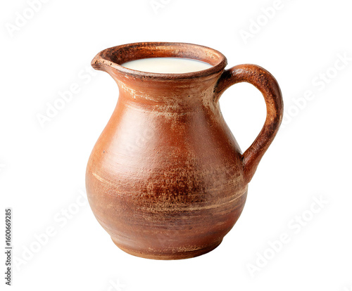 Rustic ceramic milk pitcher filled with creamy liquid on a white background, presented on transparent background