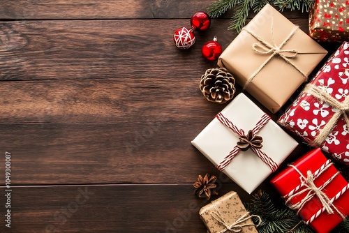 Rustic Christmas Gift Wrap Arrangement With Festive Pine and Red Decorations on Wooden Table : Generative AI