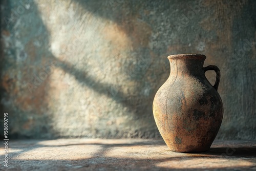 Rustic Clay Jug with Sunlit Shadows on a Weathered Background