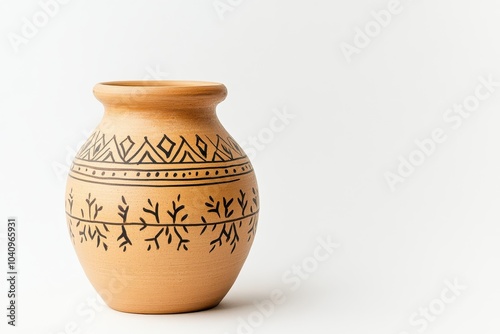Rustic clay vase with intricate tribal patterns on minimalist background