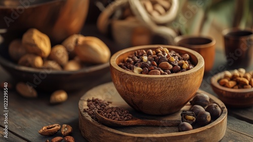 Rustic coffee setup with wooden bowls and beans