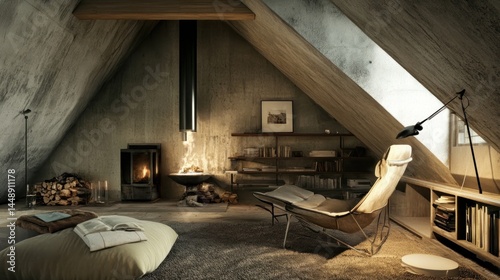 Rustic, contemporary attic room with exposed concrete and a cozy fireplace.