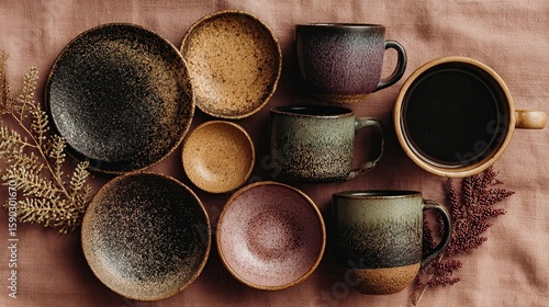 Rustic dinnerware arrangement with textured ceramics on a textured linen cloth