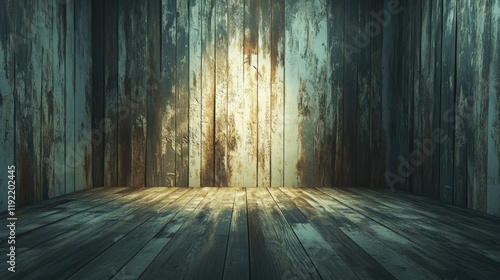 Rustic Empty Room with Weathered Wood Walls and Floor, Soft Light Illuminating the Space, Perfect for Mood Creation and Background Setting