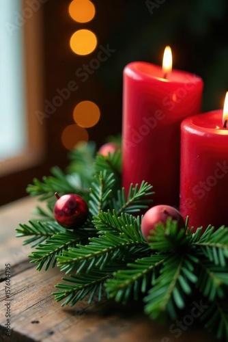 Rustic fir wreath, red candles, bokeh Wooden table, pre-Christmas , copy space, wood, vintage