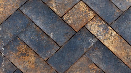 Rustic herringbone-patterned tiles with a weathered, textured surface in blue and brown tones.