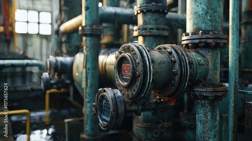 Rustic Industrial Pipes and Gauges: A Close-Up View of Aged Machinery in a Factory Setting