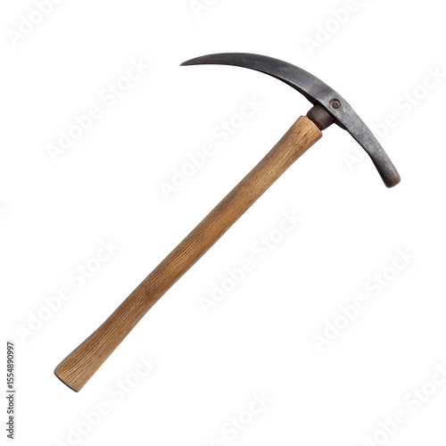 Rustic mining pickaxe with curved metal blade and wooden handle isolated on a white background for abstract industrial themes Transparent background or png