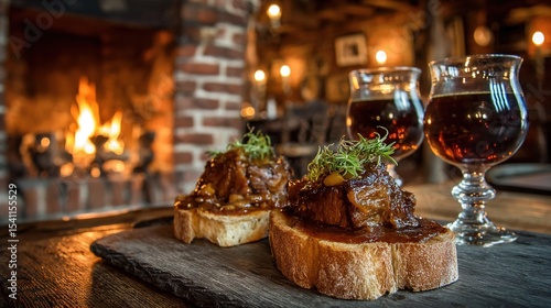 Rustic Open-Faced Roast Sandwiches with Herbs and Dark Ale by a Brick Hearth, Capturing the Cozy Warmth and Culinary Charm of a Medieval Tavern Setting