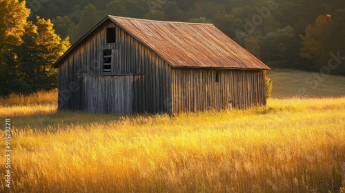 Rustic Outdoor Scene of a Weathered Barn in a Field of Golden Grass at Sunset, Tranquil Countryside Landscape